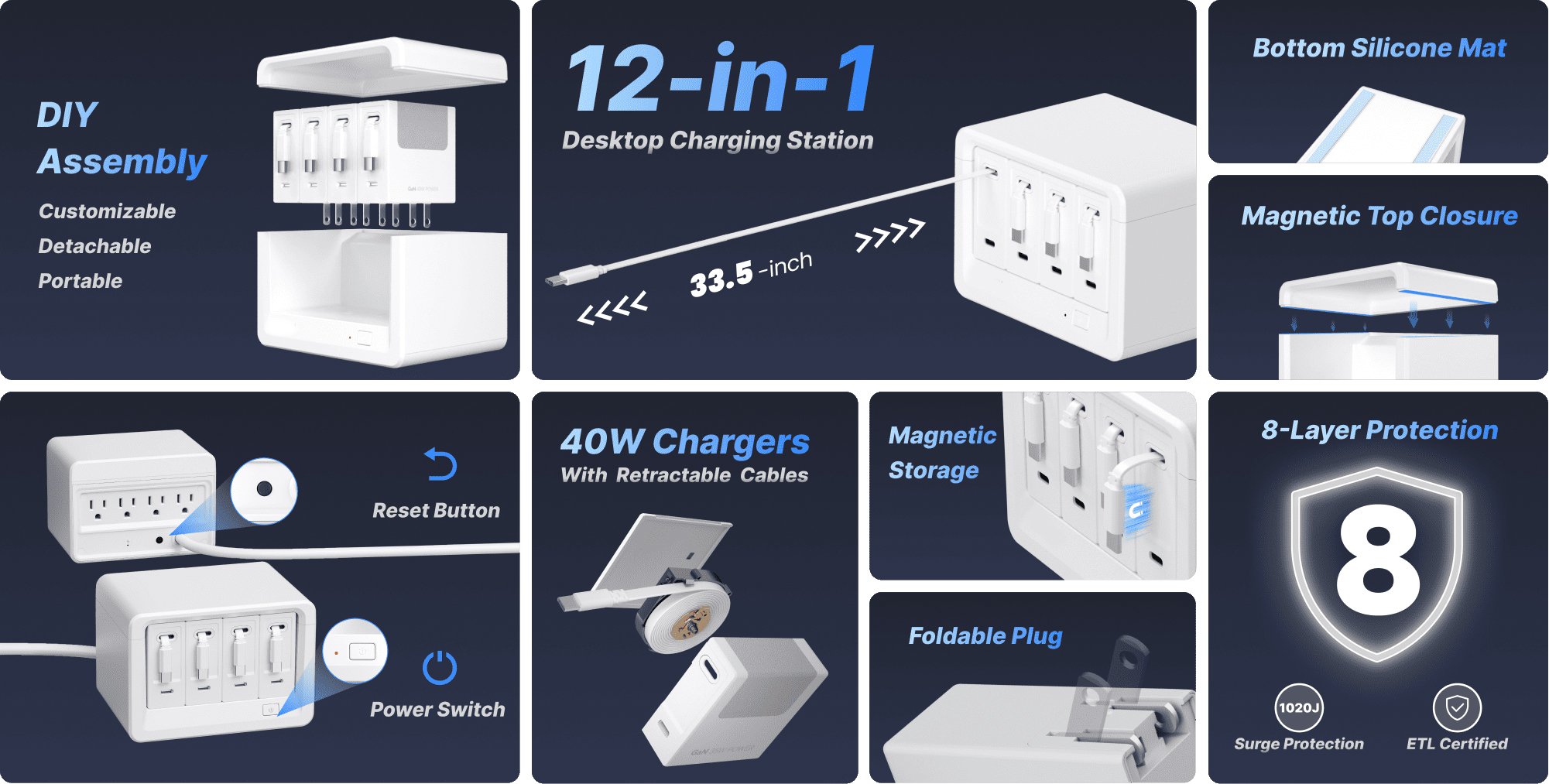 Compact power strip with 4 retractable chargers, designed to power 12 devices while keeping your workspace neat and organized.