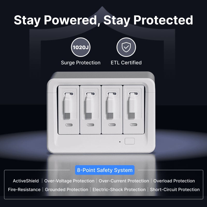 1020J Surge Protection shields your devices from voltage spikes, while ETL-certified safety features prevent overheating—ensuring secure and reliable charging with 8 layers of protection.